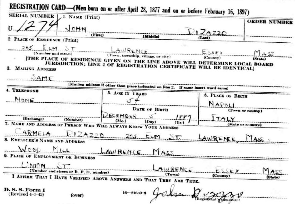 - World War Two Draft Registration Card showing John Di Zazzo,