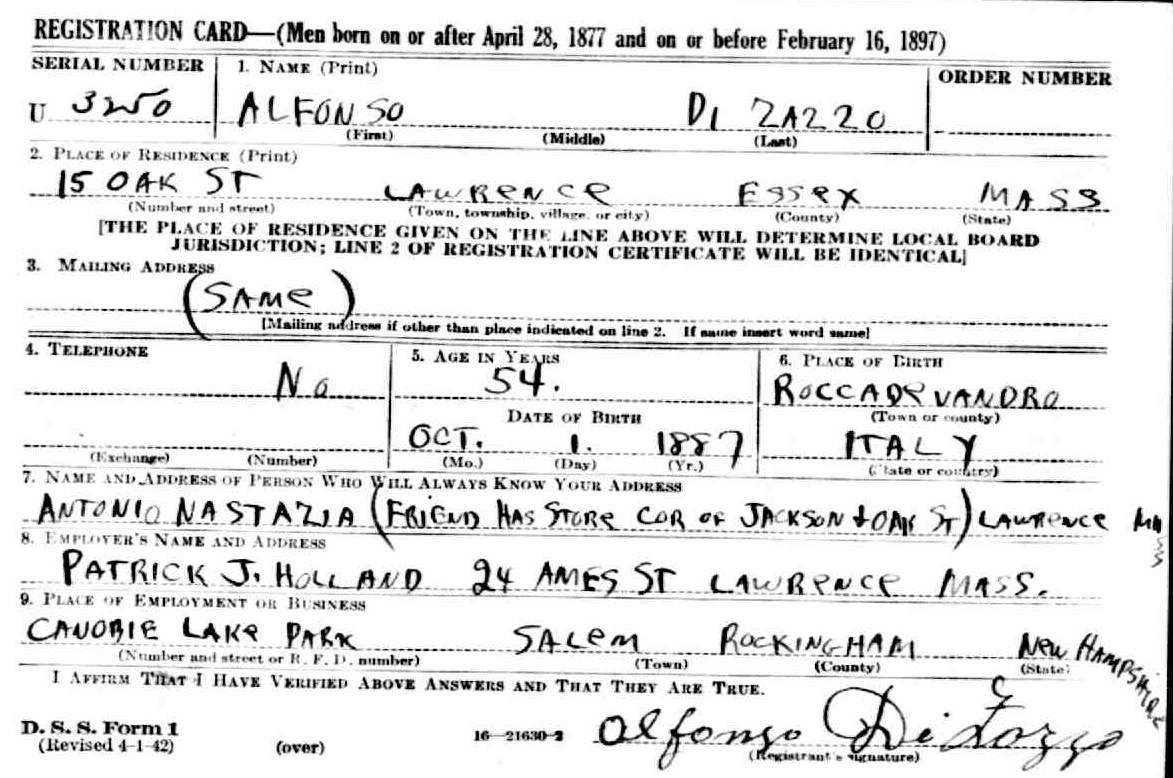 - World War Two Draft Registration Card showing Alphonso Di Zazzzo,