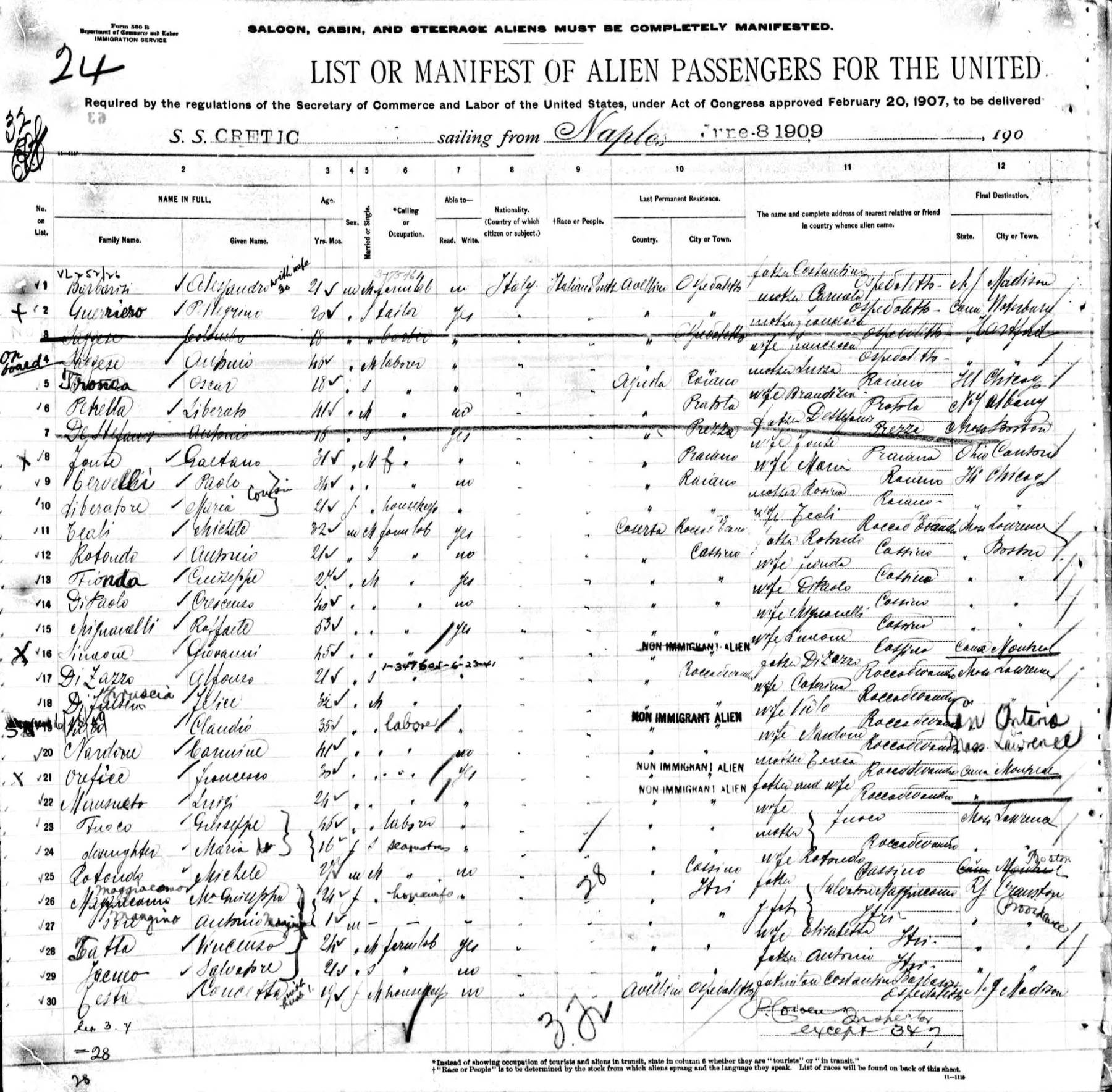 sailing from Naples; arrived Boston 22 June 1909 (see line #17); he listed as age 21, place of birth