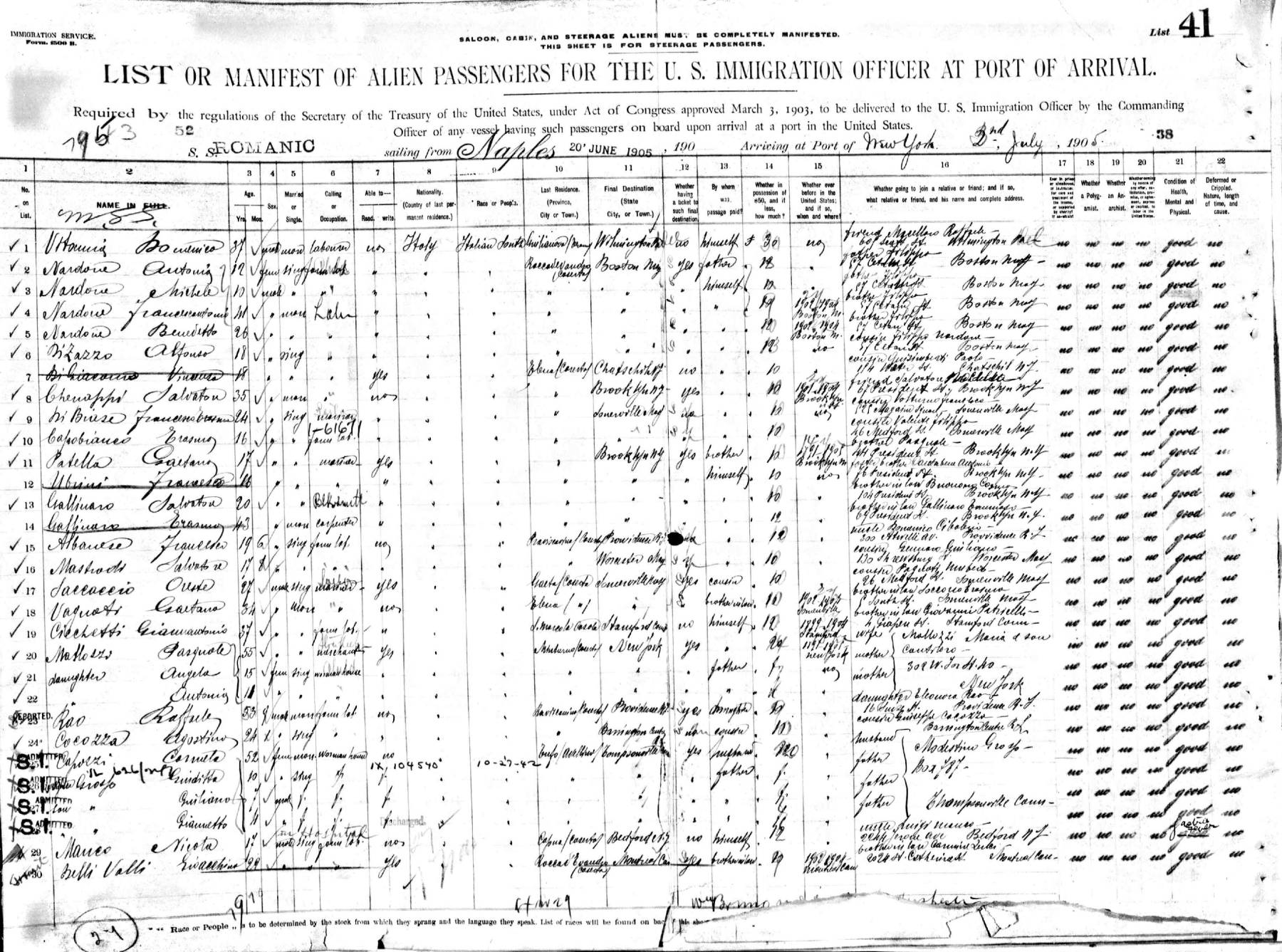 sailing from Naples; arrived Boston 3 July 1905 (see line #6); he listed as age 18, place of birth