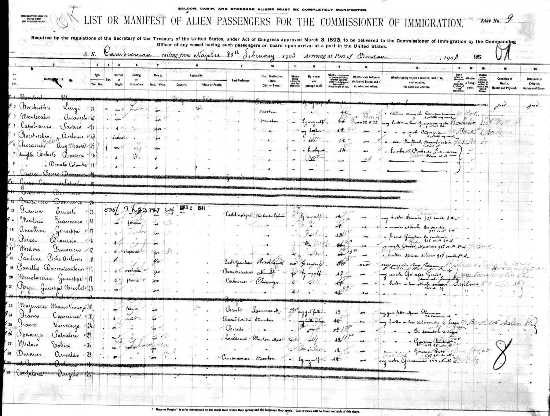 Boston from Naples 20 October 1908, shows Carmine Franco, aged 24, traveling to Lawrence, Mass, to meet