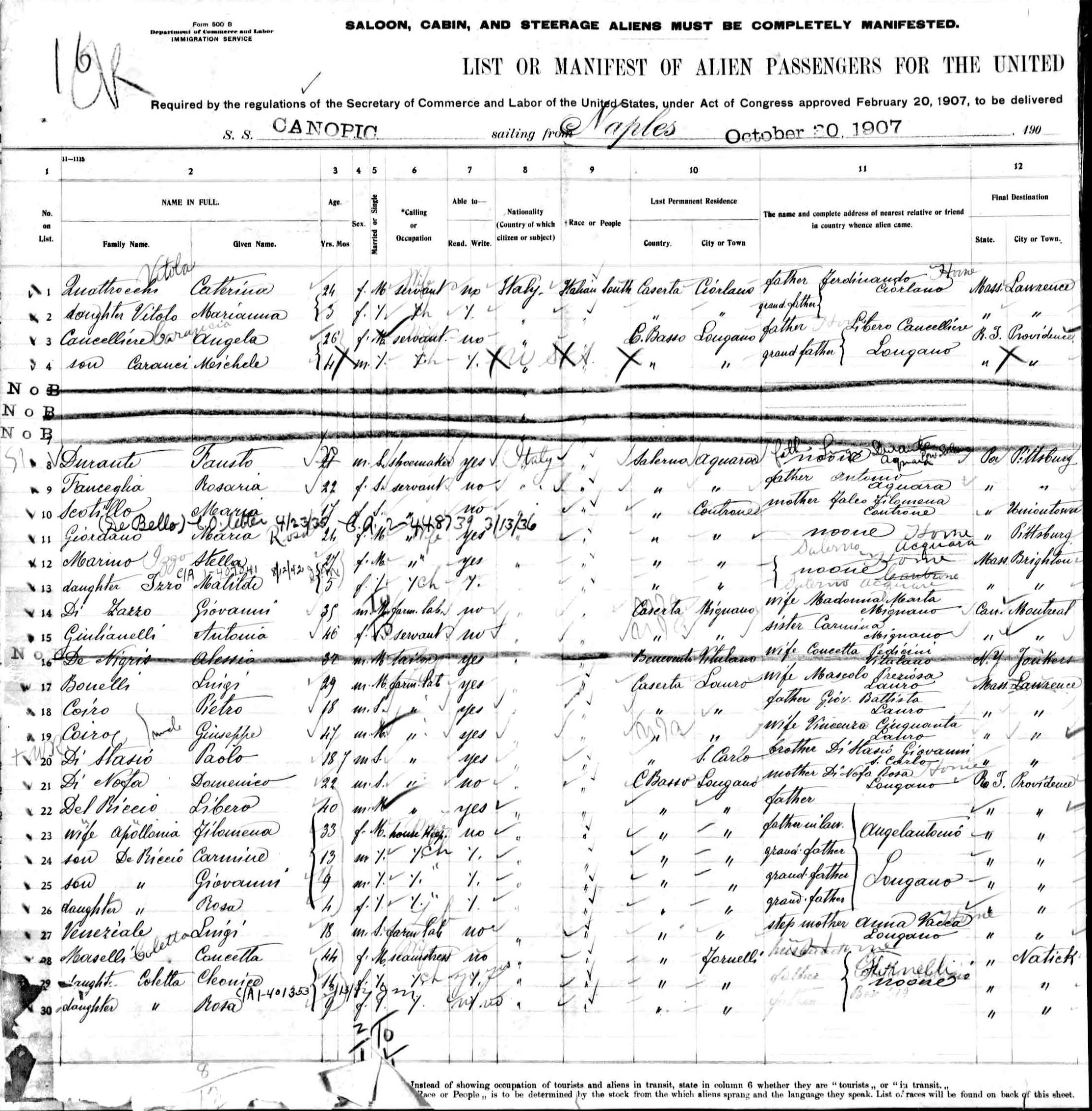 departed from Naples 30 October 1907 and arrived Boston 11 November 1907,