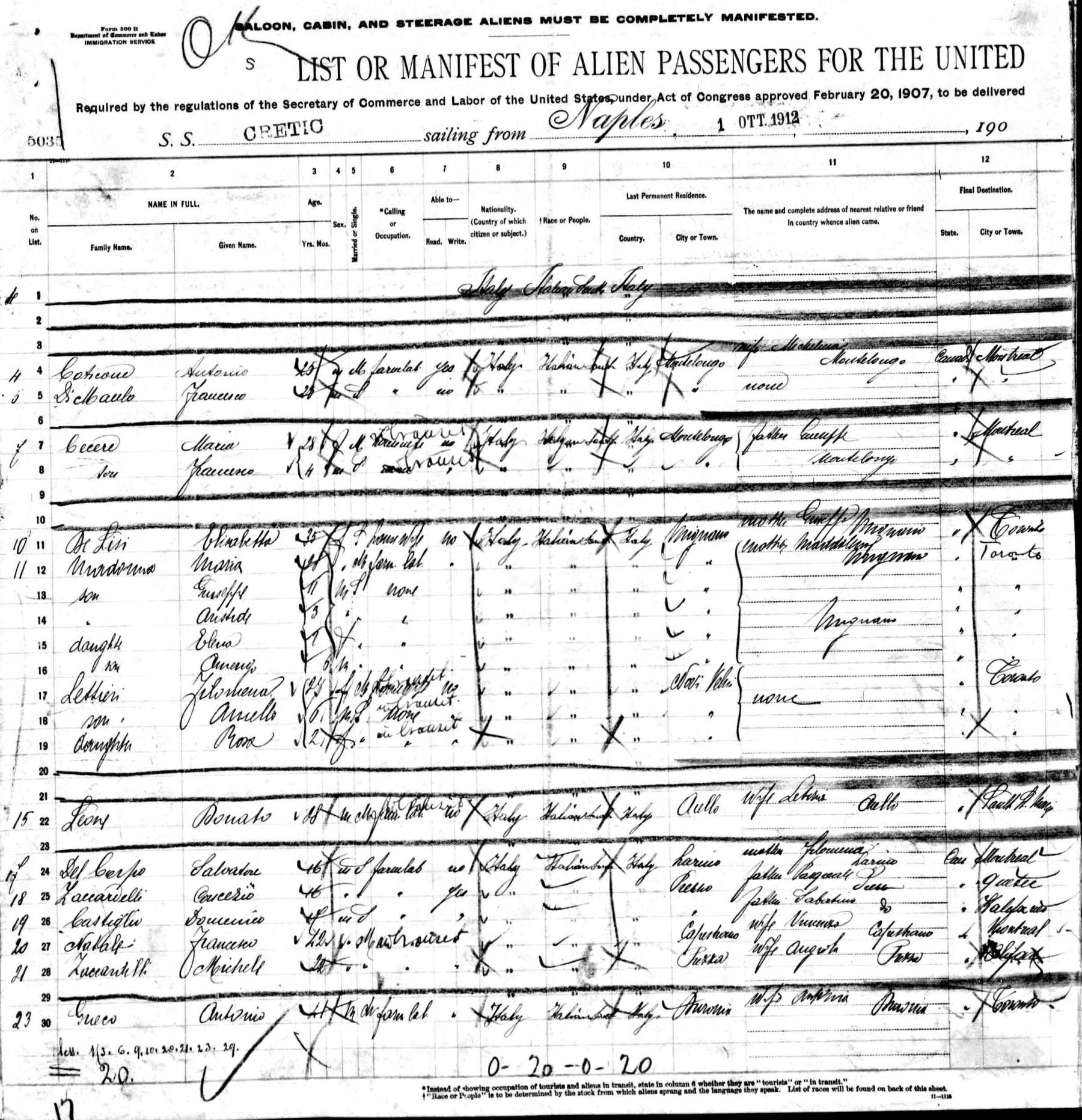 departed from Naples 1 October 1912 and arrived Boston 14 October 1912,