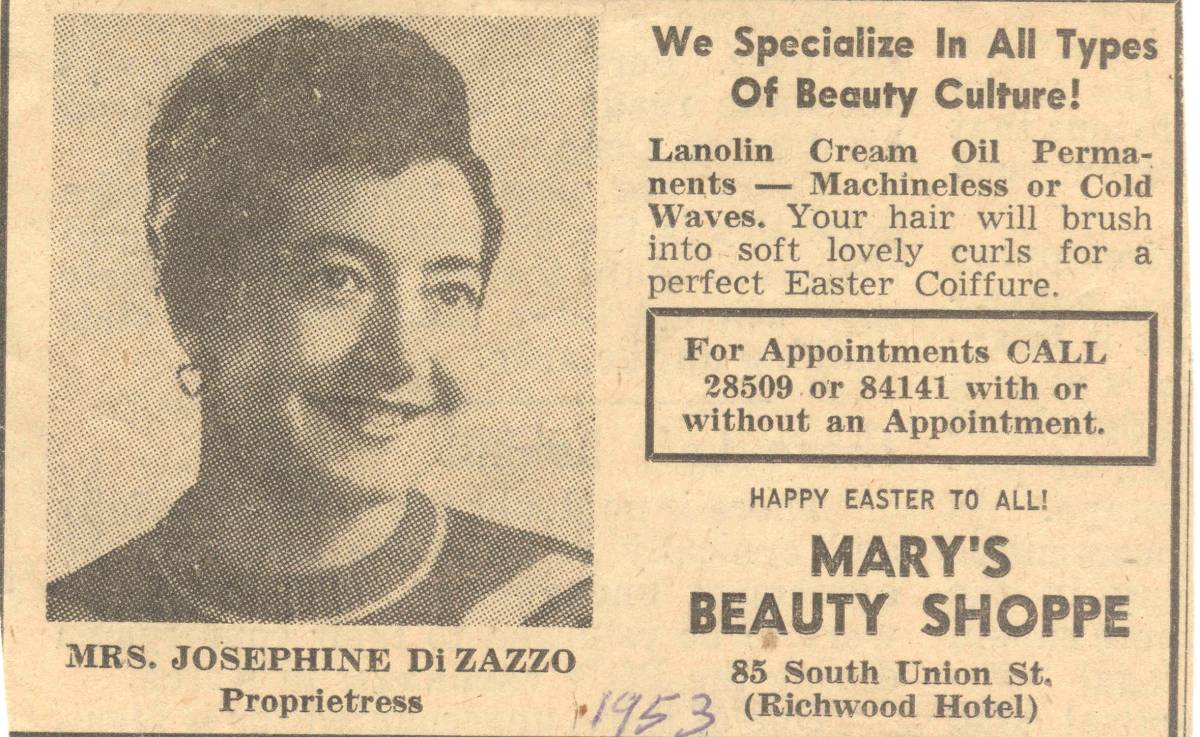 The services included a "treatment," shampoo and wave, a tint, and so forth. The cost for a shampoo and wave in 1950 was seventy-five cents! Other services were priced similarly.