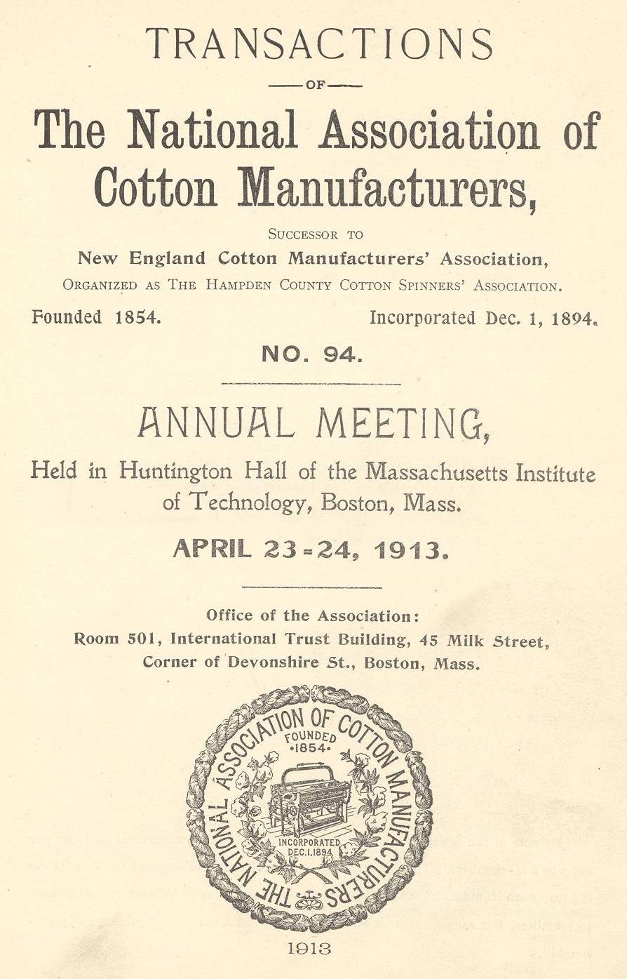 The National Association of Cotton ManufacturersPresident's Report, April 23, 1913.Edwin Farnham Greene, President, Treasurer, Pacific Mills, 70 Kilby Street, Boston Mass. /1/ Once more we are met together as an Association of cotton manufacturers... I hope at this time to analyze the character of the working people in our textile establishments, the wages paid and the effect of the tariff on such wages. I cannot, of course, in a few minutes hope to more that point out some of the facts which I sincerely believe are representative of the whole industry. The statistics are from the Pacific Mills, which as you know, is situated in Lawrence. I do this, first, because I can get at the actual facts and, second, because the people of this country seem to believe that Lawrence is a representative New England textile city. The Pacific Mills is moreover a good source of information for the reason that we have a worsted mill, a cotton mill and a finishing works, comprising, with the exception of silk and jute, almost the whole range of the textile industry from the raw materials to the finished product. First, as to the character of the people. For years, hundreds of thousands of foreigners have been streaming into our country, in some single years more than a million, and little thought seems to have been given as to how all these people are to be given employment even in this large country. Most of them are not skilled laborers. At the present time the Pacific Mills is employing in Lawrence more than 7,000 operatives comprising thirty odd nationalities, fairly well distributed among them all. Quoting from MR. PARKER, in an address which he gave two years ago,– "To follow a bit of cotton or wool from the bale to the finished product would serve to introduce one to the various nationalities about as follows: The bale would be unloaded from the car by an Austrian Polander, a farmer at home, who prefers to work out of doors. When trucked to the picker room it is handled by Syrians, not long in the country and not familiar with mills work. These men are quiet and industrious, they soon learn our language and apparently are here to stay. Next it goes to the card room, where many of the men who tend the cards are Portuguese; they do not speak English, nor can they read and write in their own language. On the roving frames we find middle-aged Irish girls who have worked for years as frame tenders. Next comes the spinning room, and here the girl spinners are young French-Canadians or children of French Canadian parents, quick and active, with nimble fingers. In the weaving also we find the French-Canadian weaver, 70 per cent., and she is an excellent worker, a few English and Irish still survive, but are out-numbered. The Canadian girl is not over-anxious to learn English, she has plenty of companions who speak her native tongue and she does not feel the need of other friends. She is apt to return to Canada for a visit quite frequently. In the worsted weaving another class has recently appeared unobstrusively–weavers to the number of over two hundred from France and Belgium. These are energetic workers and have taken a place near the front rank in earnings. When the woven cloth goes to the print works we find still another nationality handling it. Not many French-Canadians and not a single Portuguese. The printers and engravers, skilled workmen who begin in boyhood and serve seven years learning their trade, come mainly from England and Scotland; 32 per cent. of all the operatives in the print works were born in England. In one of the dyehouses difficulty was found in getting men who could endure the dampness, and it was only when some Russians from the North Baltic provinces were hired, that men were found who could work all day with their hands in cold water. Greeks who are said to be quite numerous in Lowell are not plentiful in Lawrence. In the worsted spinning room, young Italian boys have recently been tried as spinners and make a good impression." According to statistics gathered by the United States Immigration Committee in May 1909, when actual returns were made of 4,911 of our operatives, not including office employees, sixy-one out of every one hundred foreign-born could speak, read and write in English, twelve could speak but not read and write, while twenty-seven were wholly ignorant of our language; of this latter thirty-nine–twenty-seven could read and write their native language, but there were twelve who could not. Thus will be seen that the textile mills of the country give employment to a large number of these immigrants who are frequently illiterate, with no skill and not even natural ability of hand or mind... NOTES: /1/ Mr. Greene was president that year of the National Association of Cotton Manufacturers, which in 1954 became the Northern Textile Association, and which since 2002 has been the National Textile Association. He was also treasurer of the Pacific Mills; at that time treasurer was the chief officer of the mill. |