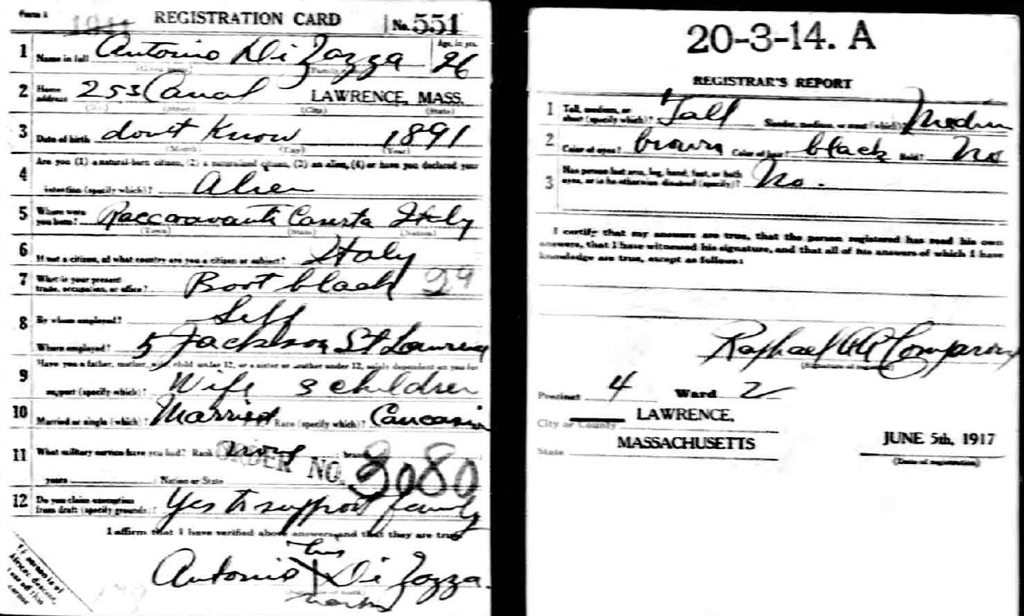 - World War One Draft Registration Card showing Antonio Di Zazzo,