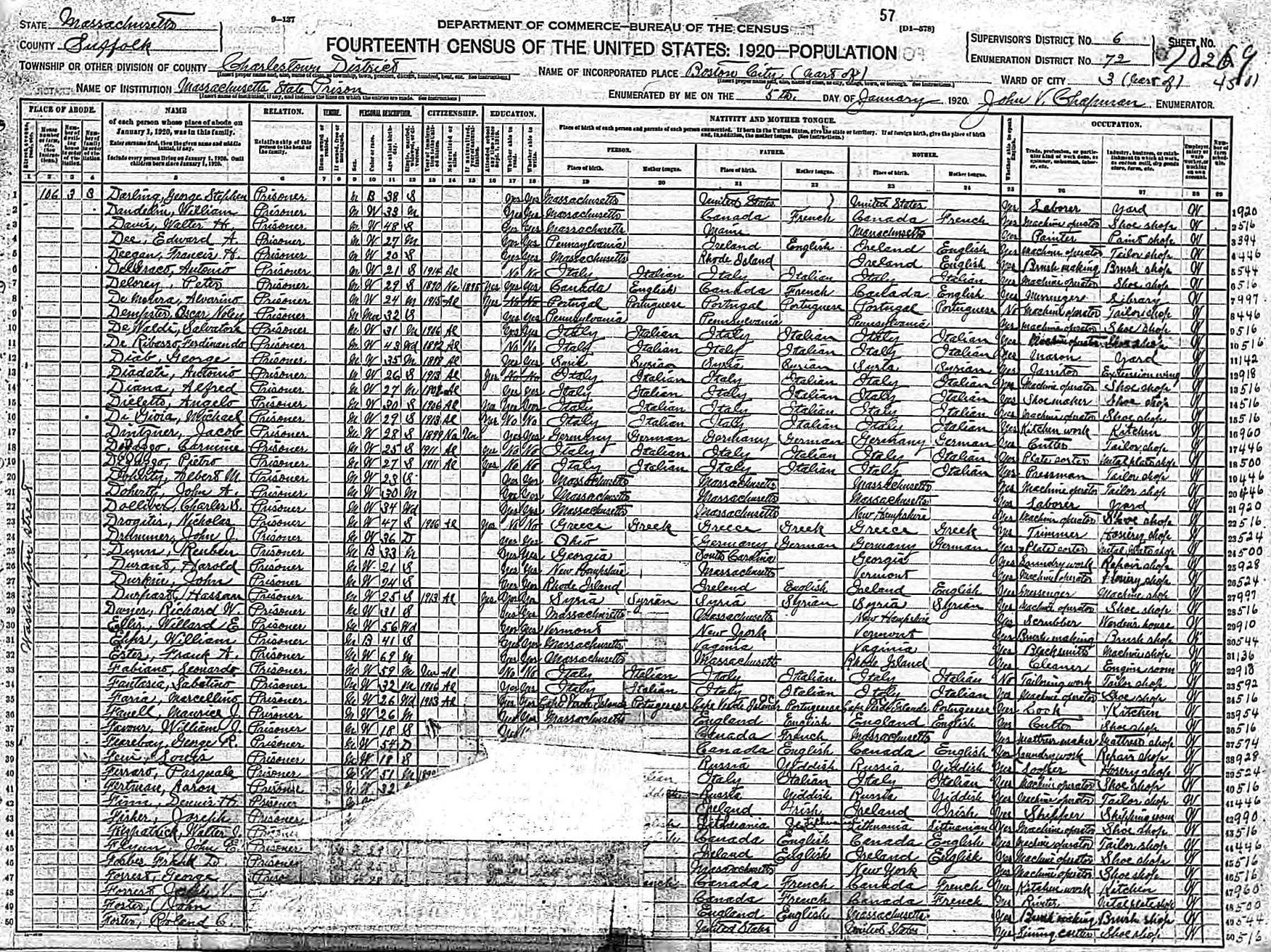 having immigated from Italy in 1911, as incarcerated at the state prison in Charlestown (Boston), Mass.