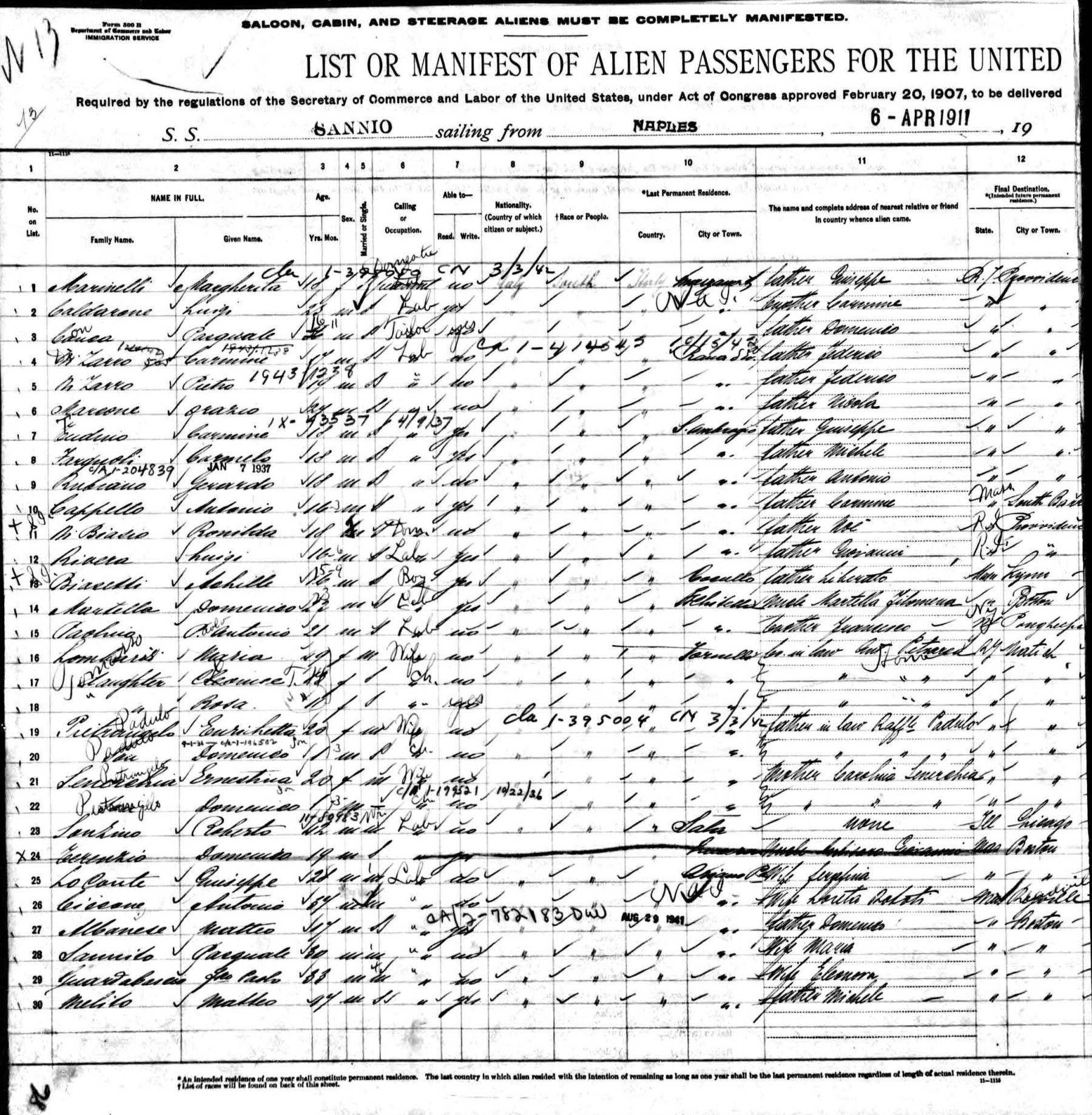 departed from Naples 6 April 1911 and arrived Boston 23 April 1911,