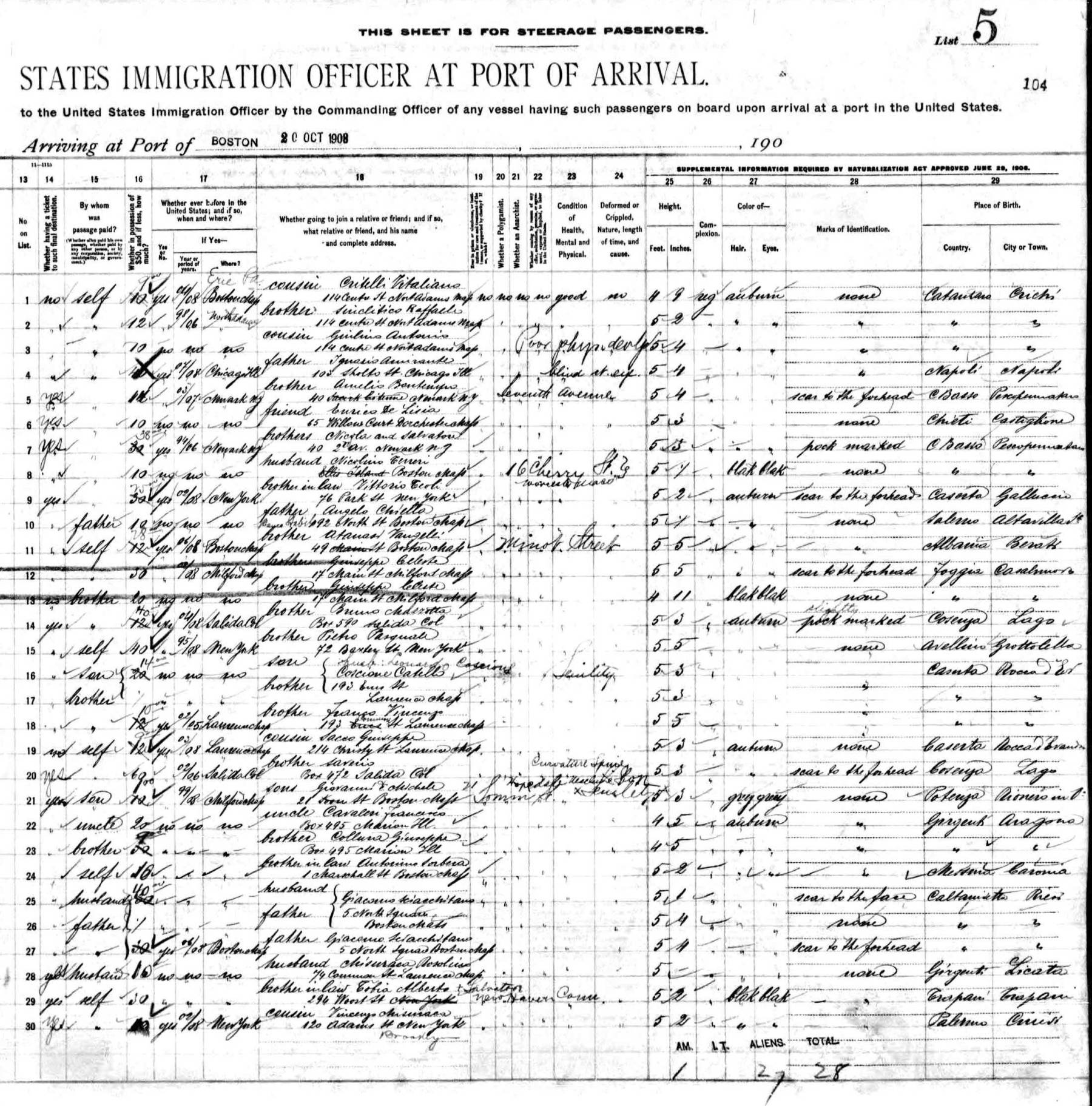 Boston from Naples 20 October 1908, shows Carmine Franco, aged 24, traveling to Lawrence, Mass, to meet